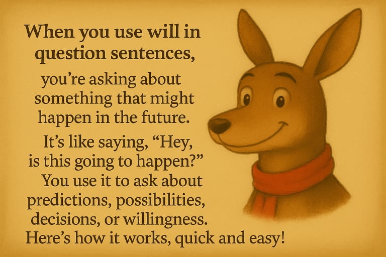 When you use will in question sentences, you’re asking about something that might happen in the future. It’s like saying, “Hey, is this going to happen?” You use it to ask about predictions, possibilities, decisions, or willingness. Here’s how it works, quick and easy!