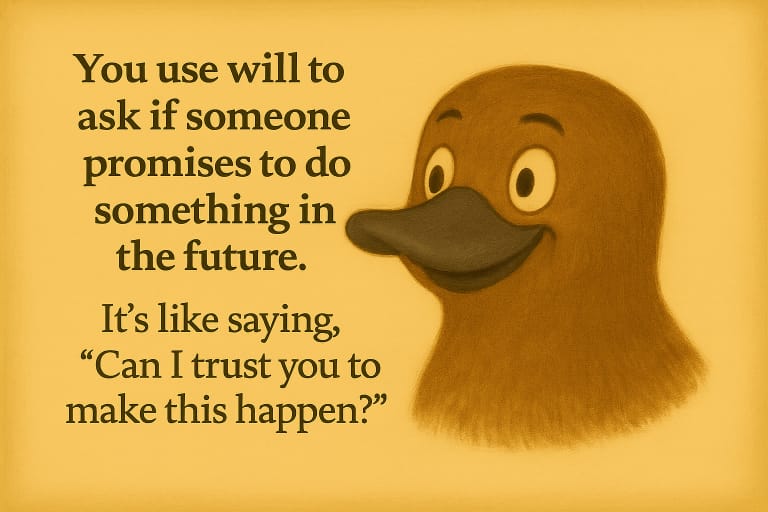 You use will to ask if someone promises to do something in the future. It’s like saying, “Can I trust you to make this happen?”