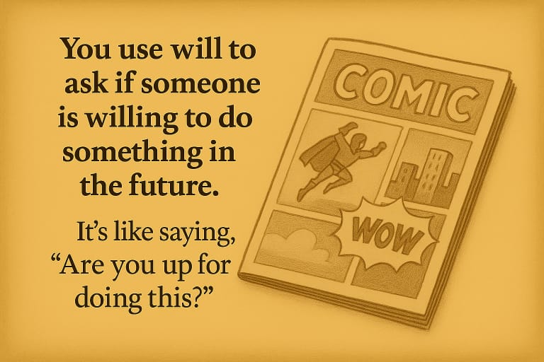 You use will to ask if someone is willing to do something in the future. It’s like saying, “Are you up for doing this?”